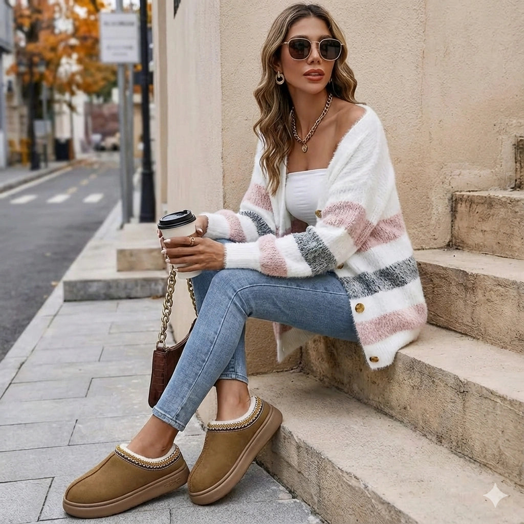 Le Pull Col V Rayé Élégance Douce™ est la pièce parfaite pour affronter les saisons froides avec style et confort. Son tricot épais enveloppe le corps de chaleur tout en offrant une coupe ample et décontractée, idéale pour un usage quotidien sans contrainte.