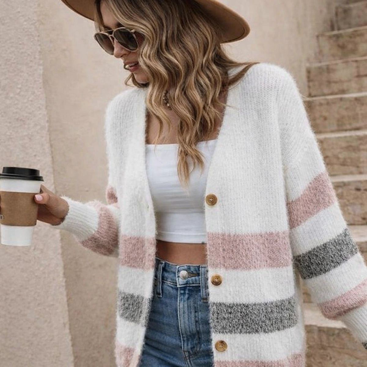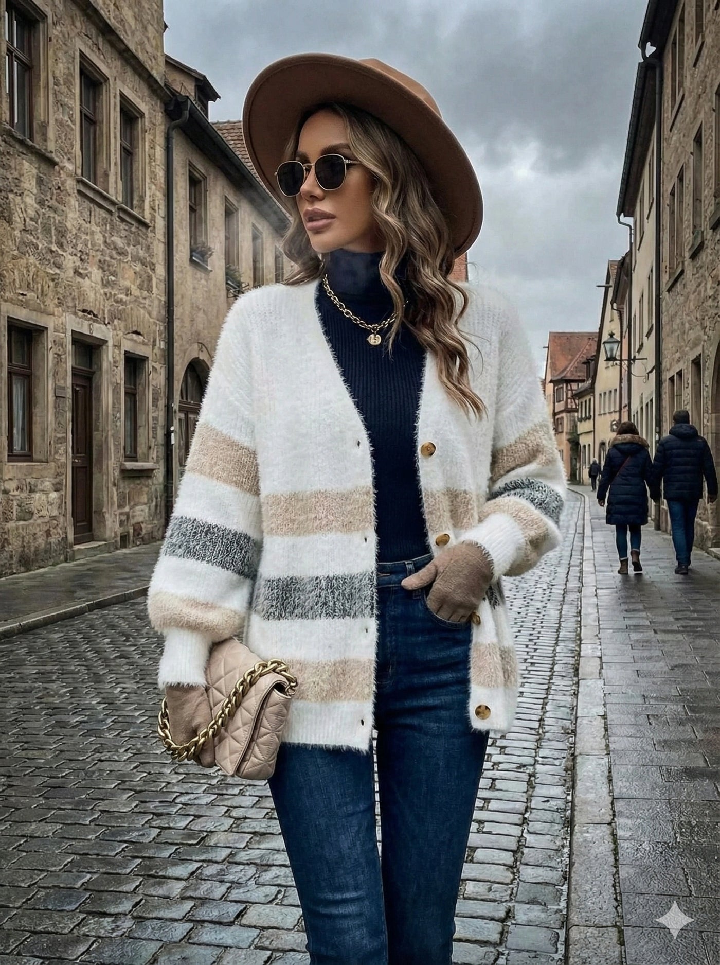 Le motif rayé apporte une touche classique et élégante, tandis que le col en V met en valeur la silhouette féminine avec subtilité. Les boutons décoratifs ajoutent du caractère au design et renforcent son style casual chic d’inspiration européenne.
