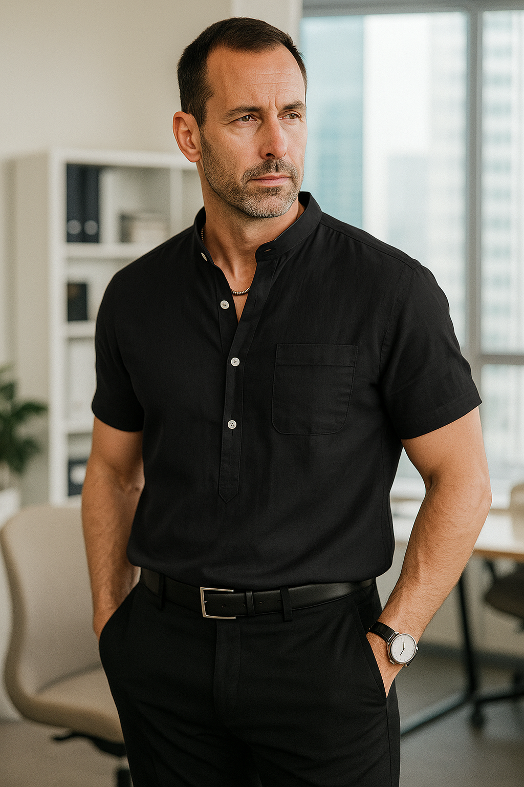 Avec son col montant et ses manches courtes, cette chemise combine fraîcheur et sophistication pour les journées chaudes.