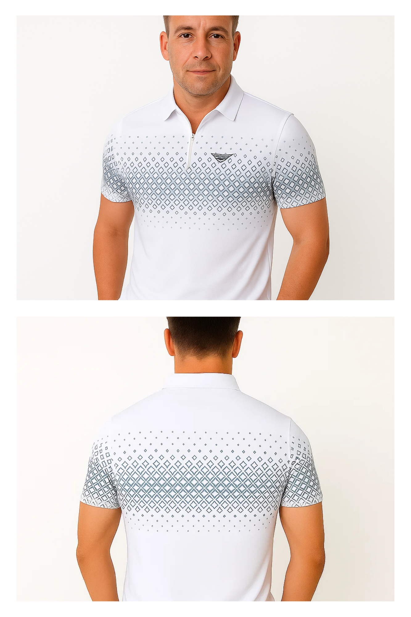 Les photos montrent le polo de face et de dos, mettant en évidence l’imprimé géométrique, la coupe ajustée et la qualité irréprochable du tissu.