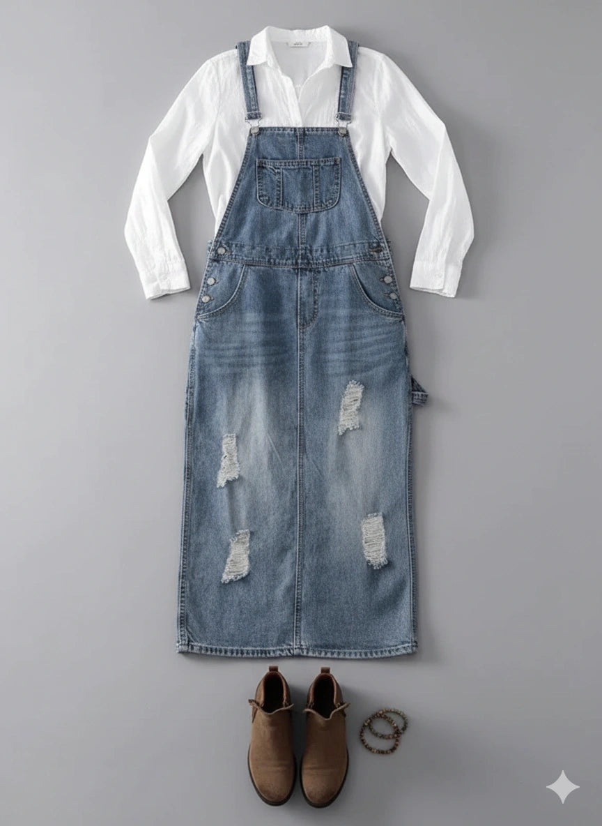 Fabriquée en denim 100% coton avec un fini délavé, cette robe chasuble offre ce look vintage déjà porté sans aucune période d'adaptation. Les détails usés créent de la profondeur et de la texture, donnant à votre tenue une sensation authentique qui ne fera que s'améliorer avec le temps.