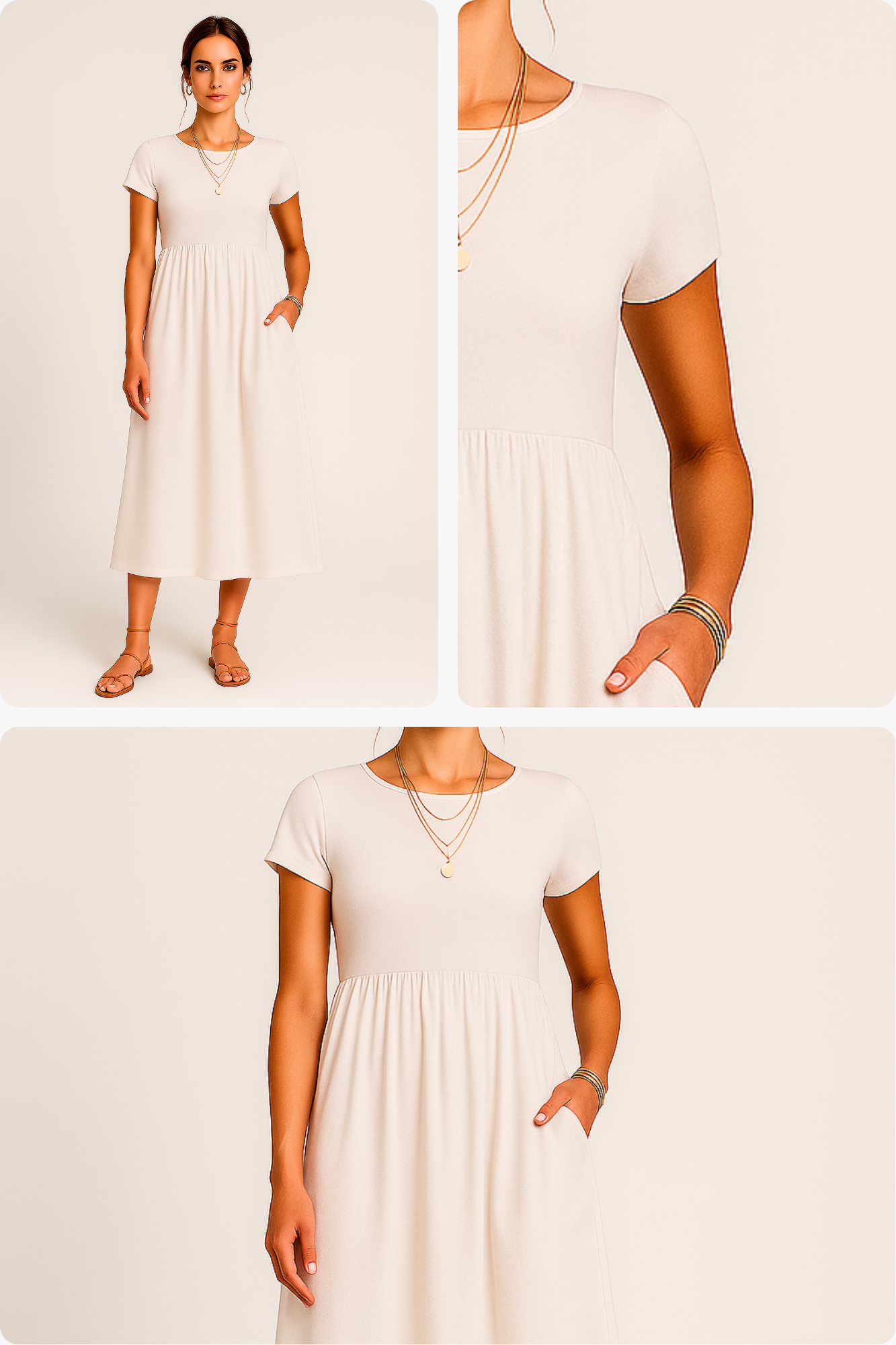 Dotée d’une découpe à la taille, de poches discrètes et d’une jupe évasée, elle allie mouvement, praticité et raffinement.