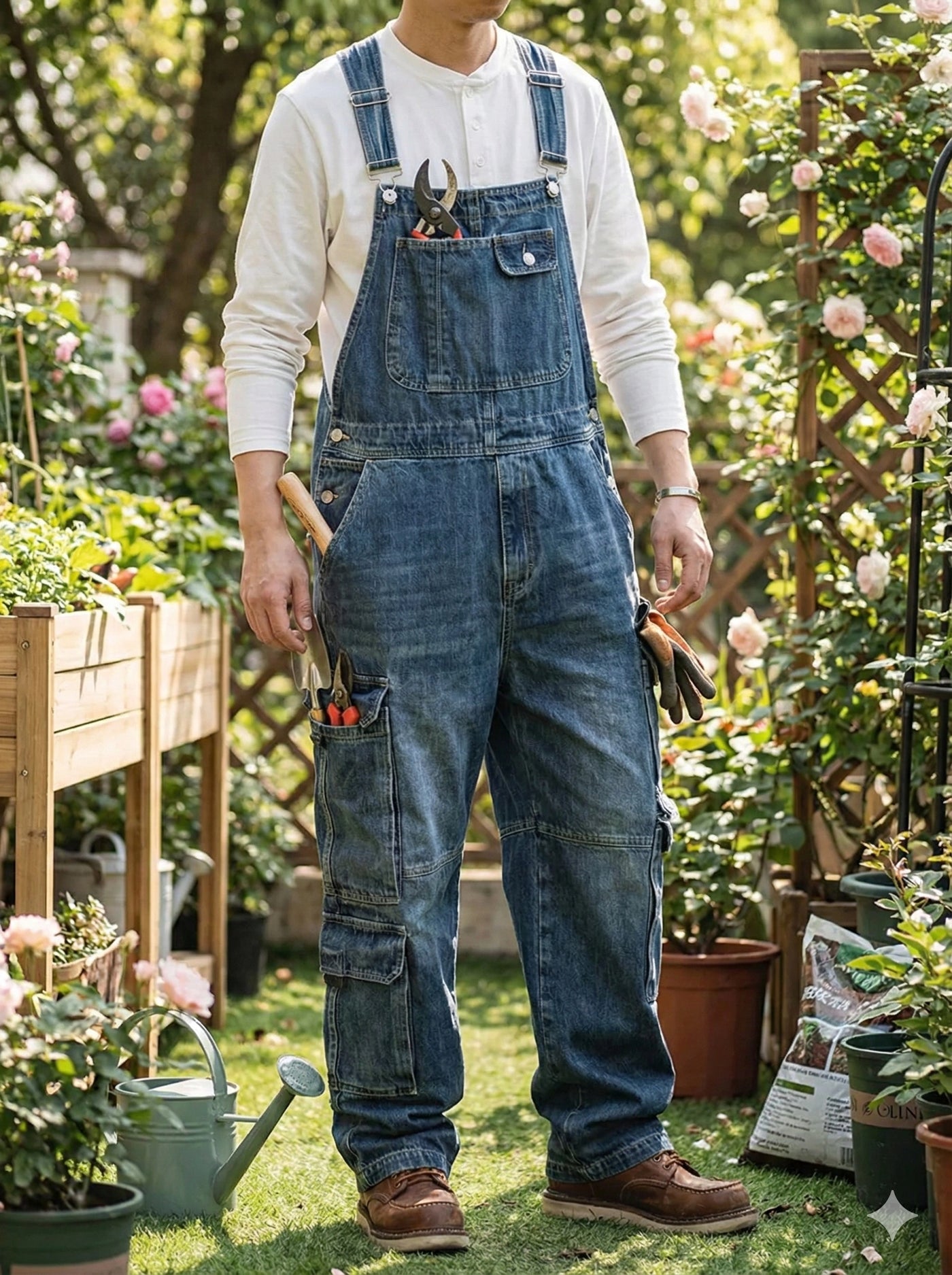 Pensée pour la fonctionnalité, cette salopette dispose de multiples poches cargo, de poches arrière plaquées et de deux poches avant spacieuses — parfaites pour ranger outils de jardinage, carnets, gants, téléphones et essentiels du quotidien. Le plastron avant à double rabat ajoute un espace de rangement supplémentaire e un look distinctif inspiré du 'workwear'.