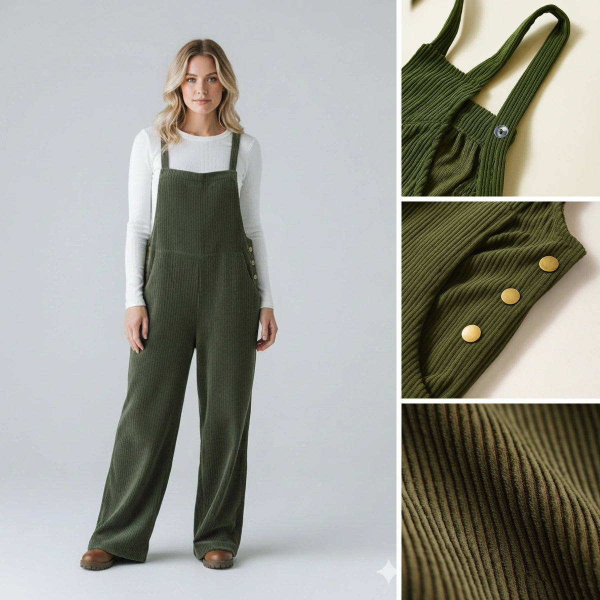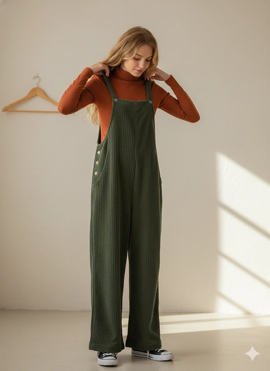 La salopette en velours côtelé Jetta est conçue pour celles qui recherchent le confort sans sacrifier l'élégance. Fabriquée dans un velours côtelé doux et texturé, elle offre une sensation chaleureuse et douillette avec une touche rustique chic — parfaite pour les journées de détente ou les travaux créatifs.