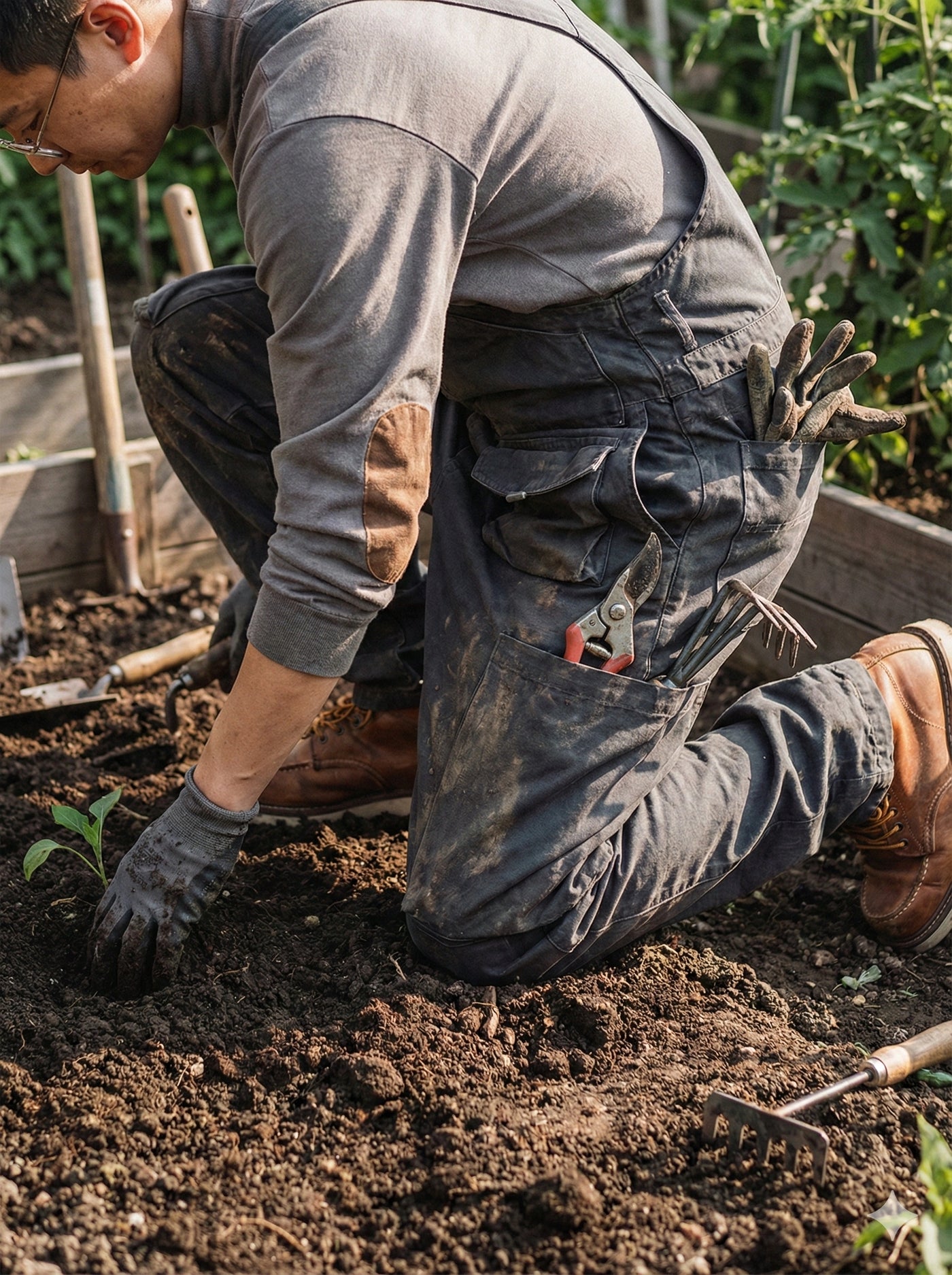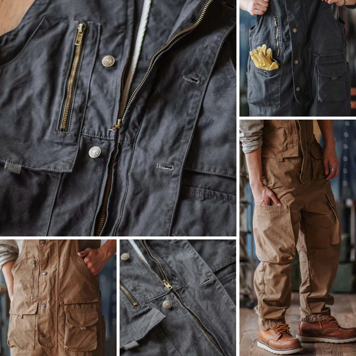 Avec 10 poches fonctionnelles, incluant des poches poitrine zippées, des poches à rabat et des compartiments cargo surdimensionnés, chaque outil reste à portée de main. Des graines de jardinage aux gants, en passant par les pinces et carnets, ce design assure une efficacité totale pour les artisans e travailleurs extérieurs. Les boutons en bronze ajoutent durabilidade e style.
